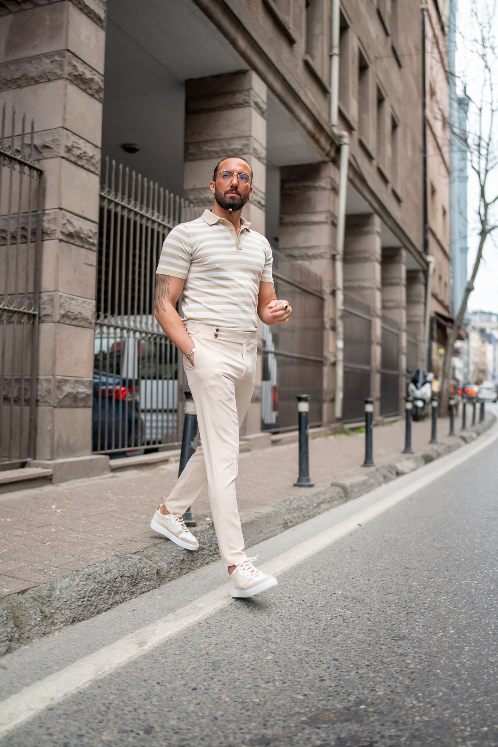 Featuring classic beige and white stripes with a fine knit texture, this short-sleeved polo is crafted from a comfortable and breathable blend of %55 Pamuk (Cotton) and %45 Polyester. A versatile piece perfect for smart-casual occasions.