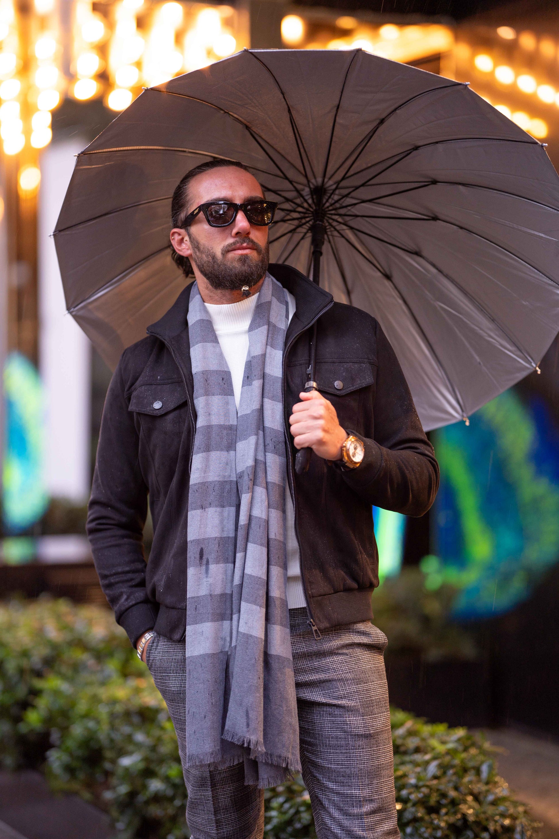 This impeccably crafted jacket in a deep, rich charcoal suede offers a sophisticated take on a classic design. Notice the subtle details like the functional chest pockets and the clean lines that contribute to its refined yet masculine appeal.