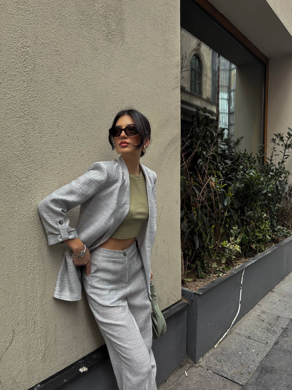 This super chic gray pant suit is all about looking cool and effortless. This two-piece set features a stylish, oversized blazer and wide-leg pants that are perfect for everything from a day at the office to a fun weekend outing.