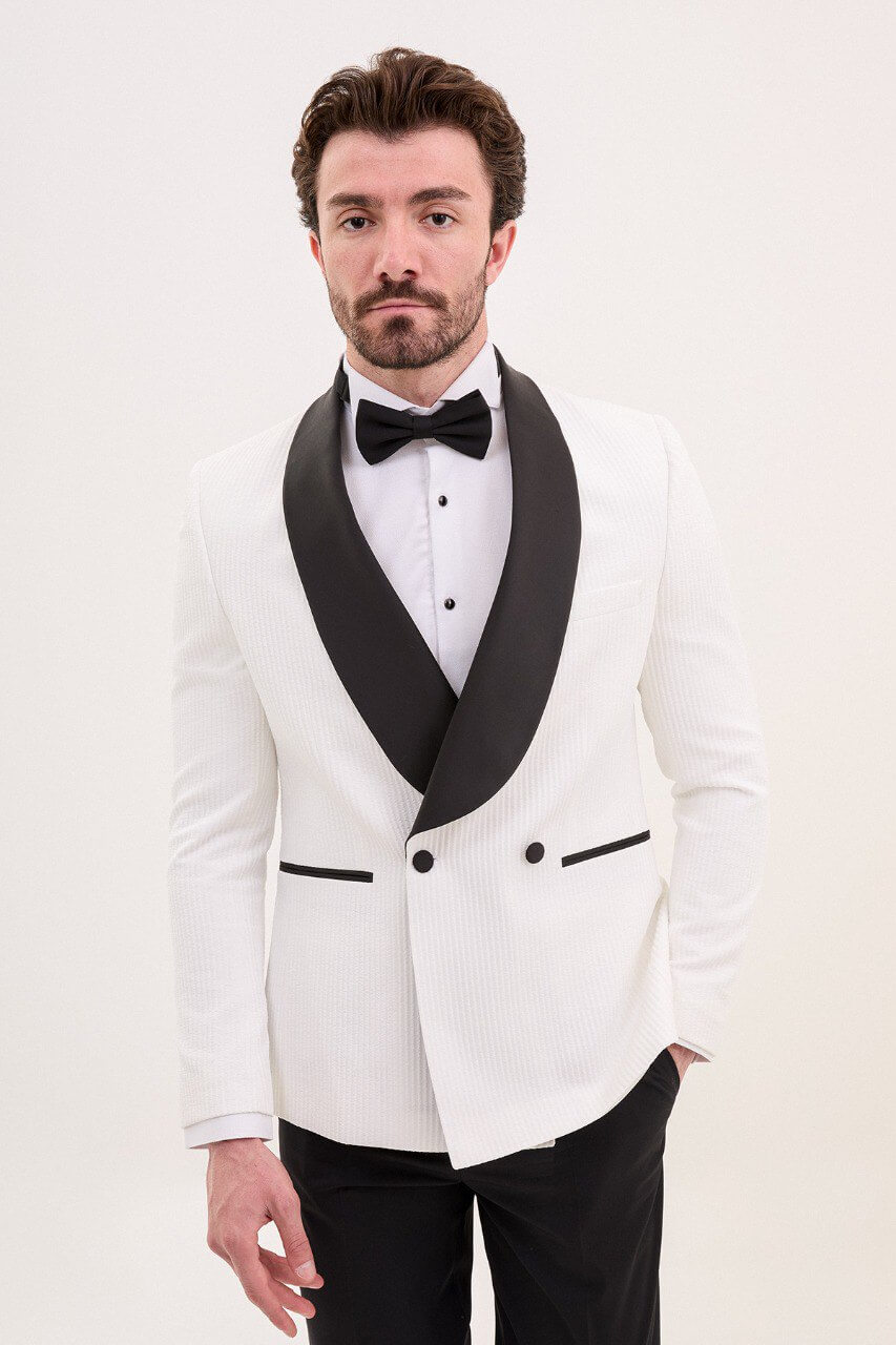 This modern slim fit double-breasted tuxedo features contrasting black satin shawl lapels, providing an elegant and confident look perfect for formal events.